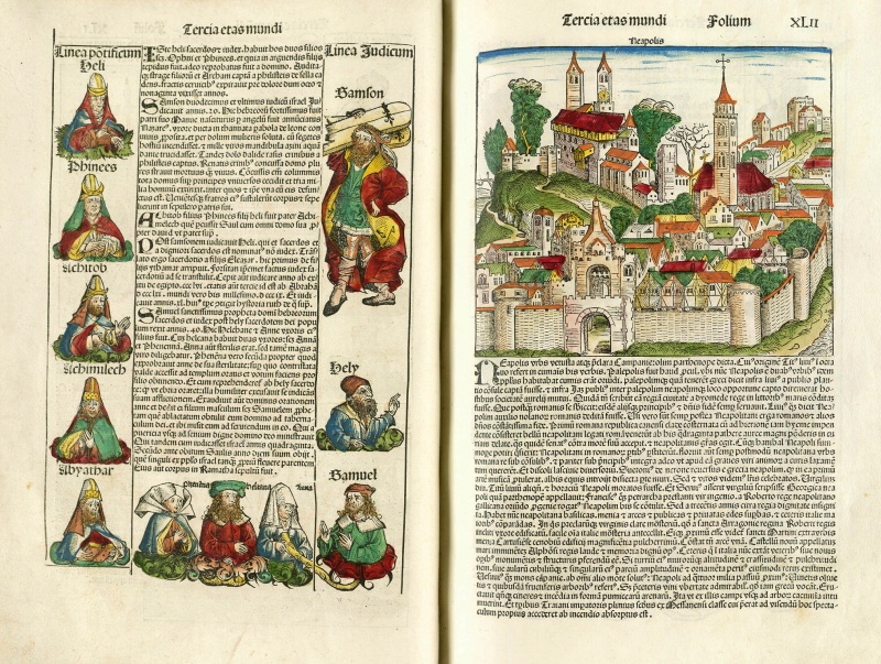 À la fois référence historique et inventaire de la culture urbaine de la fin du XVe siècle, la Chronique allait exercer une prodigieuse influence sur l’histoire culturelle, ecclésiastique et intellectuelle du Moyen Âge. Elle se distinguait notamment par son impressionnante quantité de gravures sur bois (plus de 1 800) représentant des scènes de la Bible, des atrocités humaines, des portraits de rois, de reines, de saints et de martyrs et des tableaux allégoriques de miracles, ainsi que des vues de bon nombre de cités «modernes», dont beaucoup n’avaient encore jamais fait l’objet de telles illustrations.Aujourd’hui, les exemplaires de la Chronique valent quelques 600 000 euros. les Editions Taschen se sont procurées une très précieuse copie de cet incunable, mis en couleur à la main, fidèle à l’original dans ses moindres détails, qui ont servi à réaliser un fac-similé complet d’une qualité exceptionnelle. Au cas où vous ne liriez pas le nouveau haut-allemand précoce, le livret très complète contenant des résumés des principales histoires du livre vous permettra d’explorer facilement cet incroyable chef-d’œuvre historique.