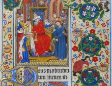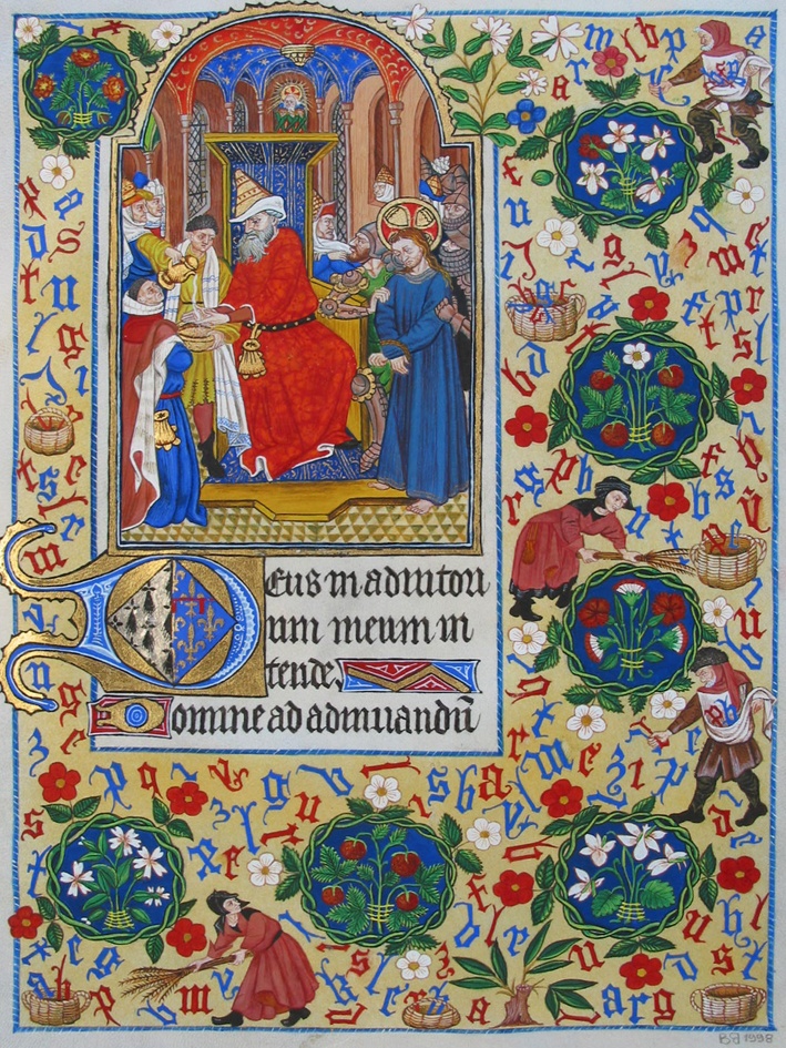 Le feuillet 135 dont la miniature représente la scène où Ponce Pilate se lave les mains en présence du Christ condamné, offre une composition originale. C’est une scène charmante et facétieuse de deux couples de paysans qui récoltent des lettres éparpillées jonchant les marges ; les femmes avec leurs balayettes de genêts, les poussent vers de grandes corbeilles d’osier, tandis que les hommes les glanent et les recueillent aux creux de leurs amples tabliers. Entre les couronnes de silènes, mouron rouge, fraisiers, oeillets, roses et violettes blanches, les lettres enchantées sautent d’elle-même dans les paniers.