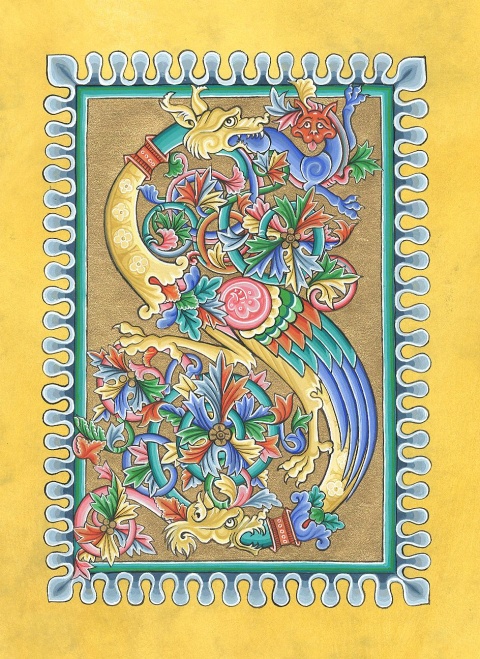 Lettrine personnalisée réalisée dans le style des lettrines enluminées zoomorphes des manuscrits du tout début du XIIIe siècle et destinée à orner la couverture d'un album de timbre. La lettrine S est l'initiale du commanditaire.
