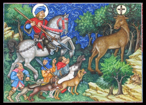 Création originale d'après une scène de la « Legende Dorée » de Saint Hubert dans le style du livre de la chasse de Gaston Phebus. Ici est representé Hubert au moment où il pensait porter le coup de graçe et où un crucifix apparaît entre les andouilliers.