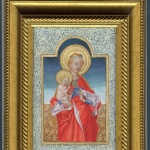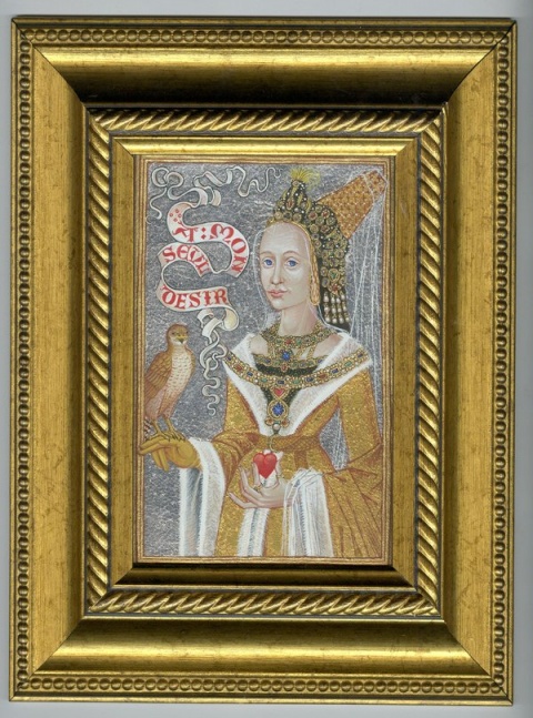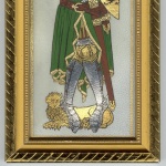 Exemples de réalisations faîtes pour offrir : miniatures sur chutes de parchemin, à thème religieux ou historique, encadrées dans un petit cadre sous verre de style renaissance.
