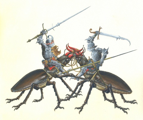 Création originale, à partir d'une photo animalière, montrant deux chevaliers s'affrontant sur le dos de coléoptères combattants. Réinterprétation d'une scène qu'on trouvait fréquemment en bordure marginale des manuscrits enluminés du XVe siècle et qui étaient appelé des drôleries.
