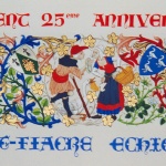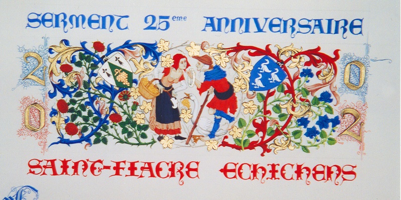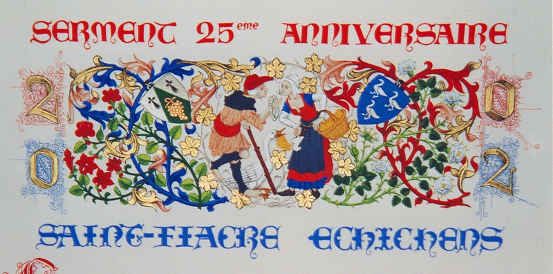 Ornemention de deux chartes d'anniversaire de jumelage entre la commune Saint-Fiacre sur Maine en Loire-Atlantique (France) et la commune d'Echichens dans le canton de Vaud (Suisse).