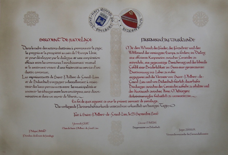 Ornementation d'une charte de jumelage entre Saint-Philbert de Grand-Lieu en Loire-Atlantique (France) et Bickenbach dans le Land de la Hesse (Allemagne) dans le style d'une charte carolingienne avec ajouts des blasons des deux communes. Calligraphie de Céline Foissey.