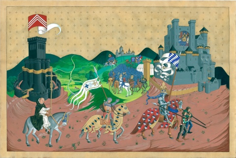 Modèle original pour un grande tenture reprenant les visuels des cartes de jeu Ortus Regni. Le Moine, le Vassal, le Champion en provenance de la Tour de Garde se rendent au Château du Roi. En arrière plan une bataille et un paysage de champs cultivés.
